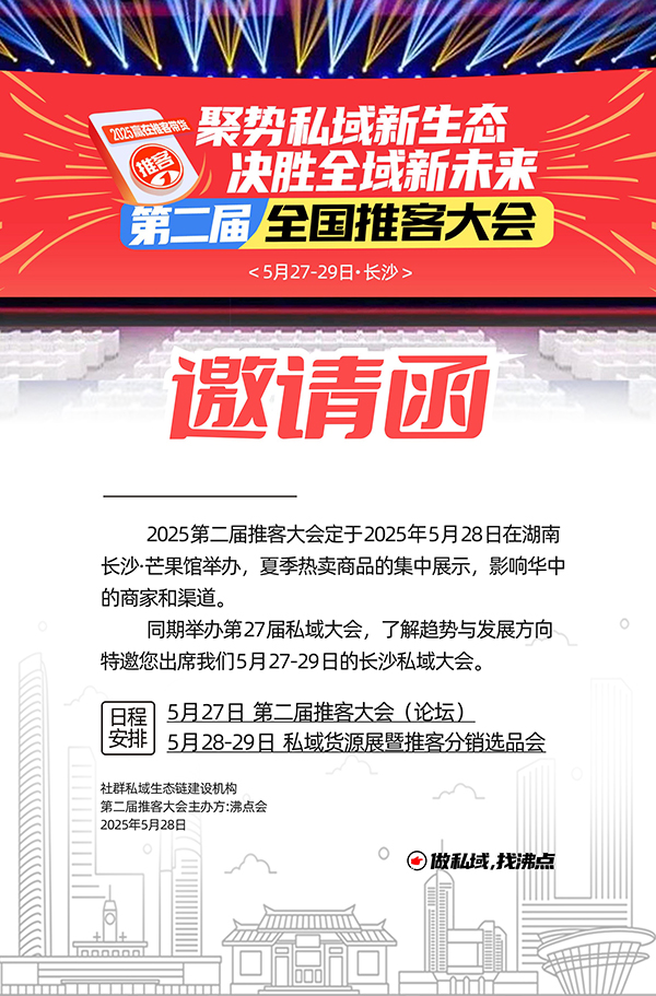 從個體創業到群體爆發,從單兵作戰到生態協同,推客經濟已進入價值爆發期。5月27-29日,長沙第二屆全國推客大會必將成為行業發展的關鍵節點——這里不僅是經驗交流的舞臺,更是資源整合的樞紐,每個參與者都可能在此找到屬于自己的創富密碼。